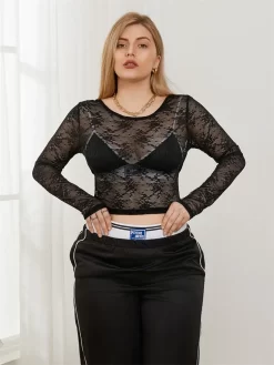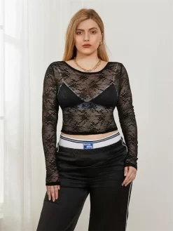 2024 Women Lace Floral T-shirt Long Sleeve Open Back Slim Fit Cropped Tee Tops Summer Fall Club Beach Sexy Shirts Smock