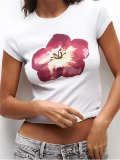 Women’s Summer T-Shirts Flower Print Slim Fit Tops Short Sleeve Round Neck Short Trendy Baby Tees