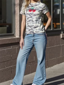 Women Short Sleeve T-Shirts Camouflage Cherry Print Round Neck Shirts Summer Casual Tops Streetwear