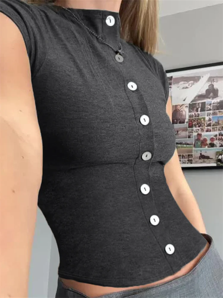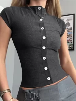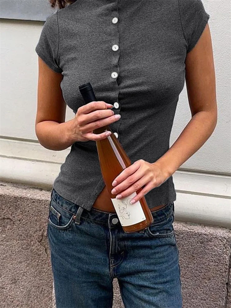 Women’s Summer Casual Basic Tops Short Sleeve Round Neck Solid Color Button Up T-shirt