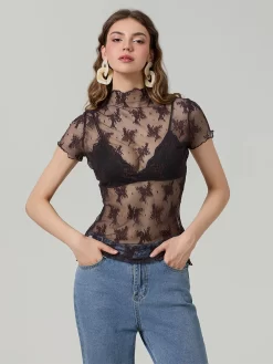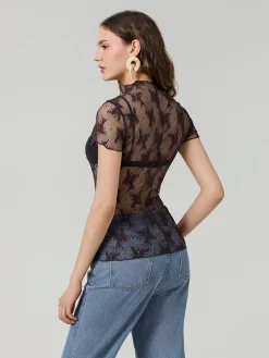 Women Lace Tops Short Sleeve Crew Neck See-through Sheer T-shirt Summer Casual Tee Shirts Clubwear